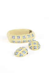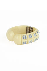 Beset with delicate blue rhinestones, this true vintage lucite ivory clamper bracelet with matching clipback earrings set is certainly worth showing off.