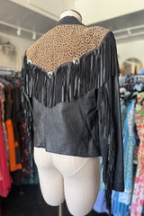 Bermans brand, tagged sized medium, this leather jacket has it all; Conch details, leopard print, and fringe for the vintage loving baddie.