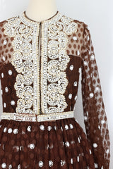 From the closet of Iris Apfel! Donald Brooks Blown Polka Dot Silk, Tulle, and and Ivory Embroidered Gown. Heavily beaded, gorgeously designed. The rounded neck with hook and eye closure above a white beaded and ivory embroidered bodice, the zip-front gathered waist of full length with hook and eye closure.